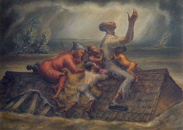 Curry’s paintings are known for their emotional intensity and dramatic compositions. His work often portrays the Midwest not as a calm pastoral landscape, but as a place of struggle, resilience, and powerful natural forces.